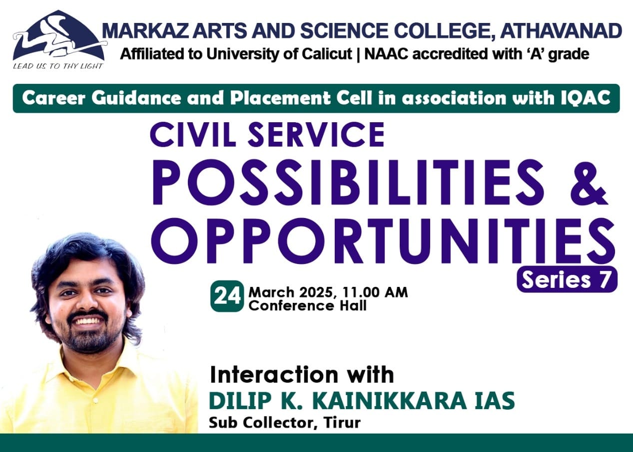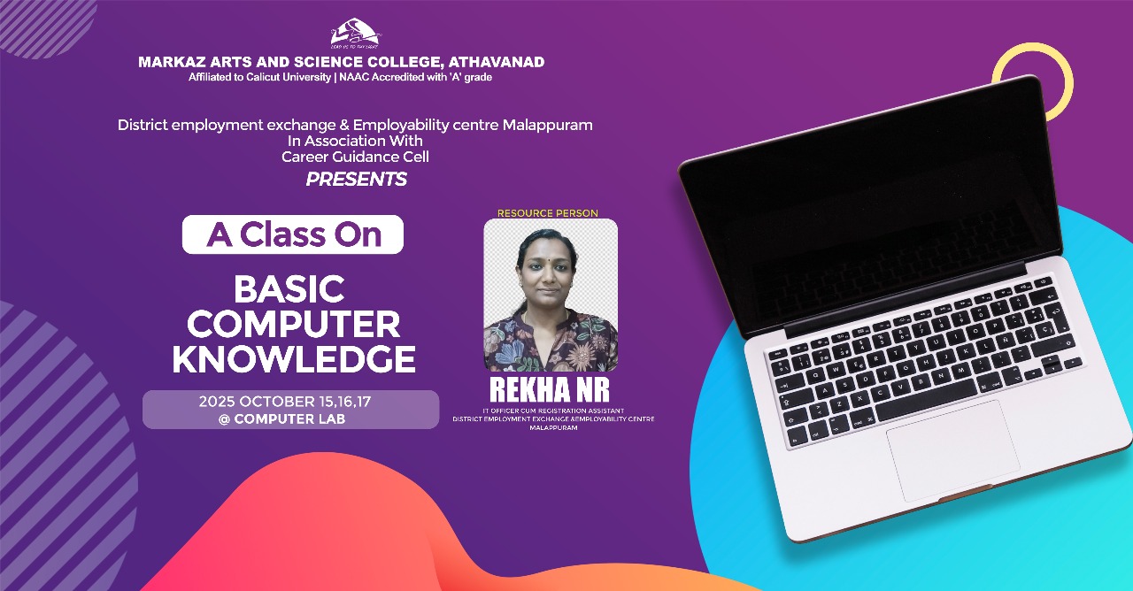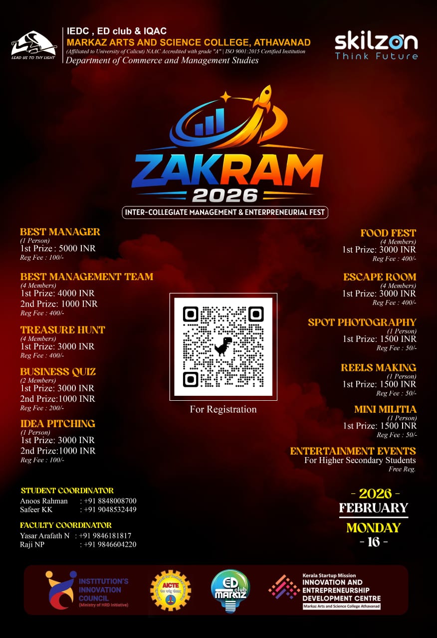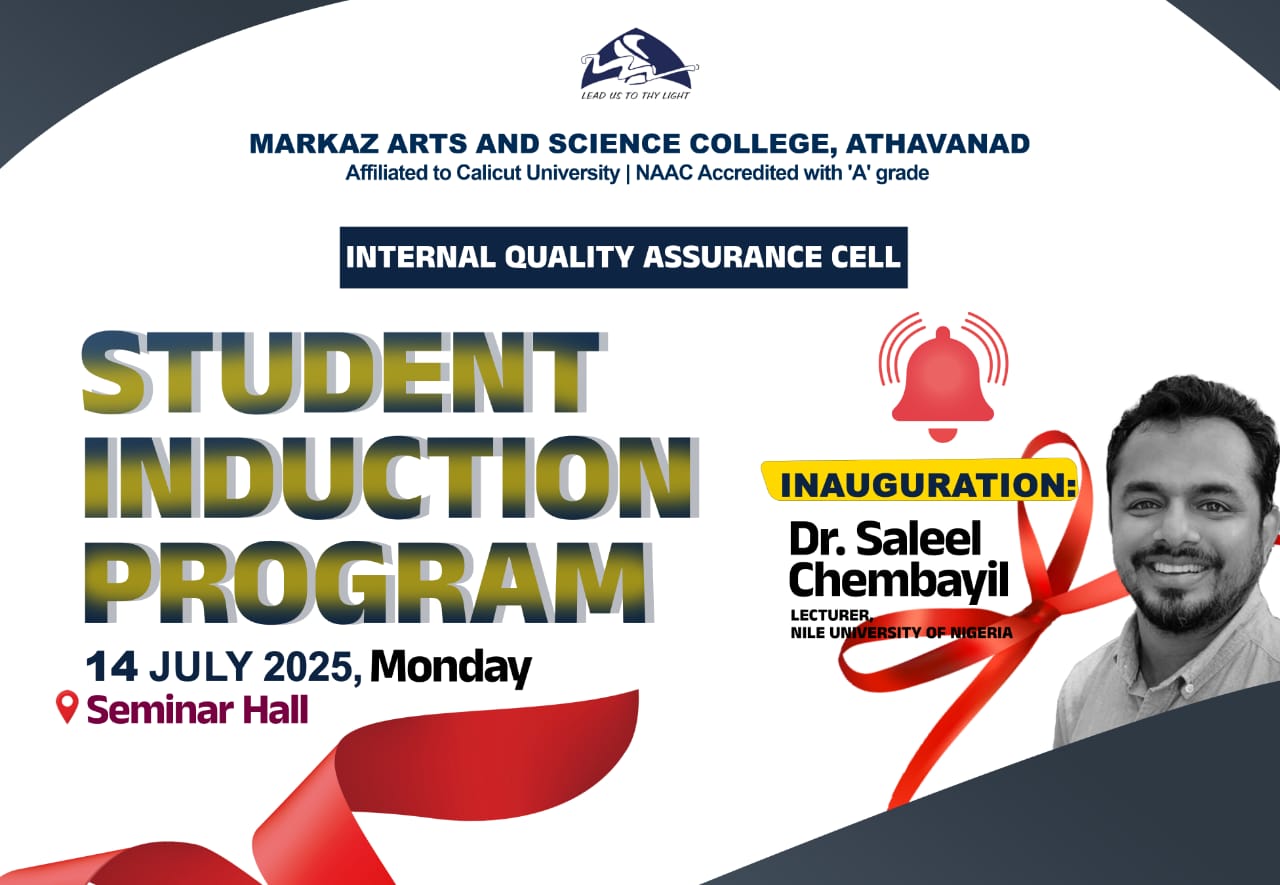 Greetings from Markaz CollegeAs Principal of Markaz Arts and Science College, it is my pleasure to welcome you to our college website.I am happy to provide you some useful information about our college and to give you a glimpse on different courses that we offer. We endeavor to provide each student with a curriculum which both challenges and inspires them to reach their individual potential. We offer nine UG courses and four PG courses from Arts, Commerce and Science. ......Read More